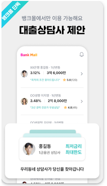 또한, 뱅크몰은 역경매 상담 기능을 제공하여 사용자가 입력한 조건에 맞는 상담사들이 경쟁적으로 금리와 조건을 제안하도록 합니다. 이를 통해 은행별 금리를 단순 비교하는 것을 넘어, 최적의 조건을 실제로 받을 수 있는 구조를 제공합니다.