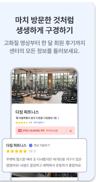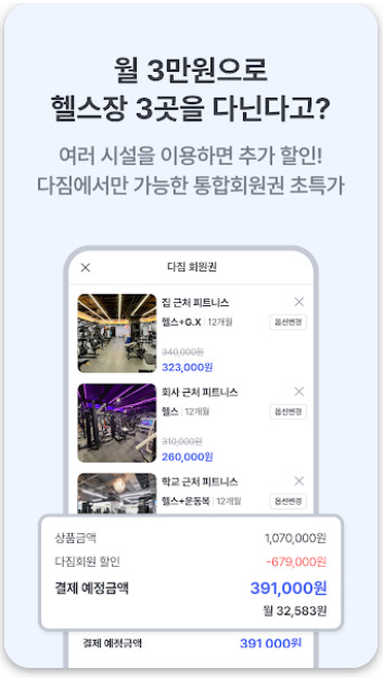 • 마음에 드는 시설은 앱 내에서 바로 회원권 결제를 할 수 있으며, 다짐 전용 할인 혜택을 받을 수 있습니다.