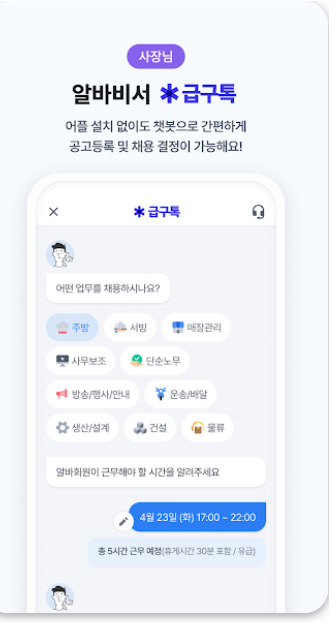 사장님은 채용 공고 등록부터 출퇴근 관리, 급여 지급까지 한 번에 처리할 수 있으며, 구직자는 당일 지급 알바를 비롯해 다양한 형태의 단기 근무 공고를 확인하고 지원할 수 있습니다. 무엇보다 채팅과 챗봇 기능을 통해 면접 절차 없이 간단하게 채용이 이루어지는 것이 가장 큰 특징입니다.