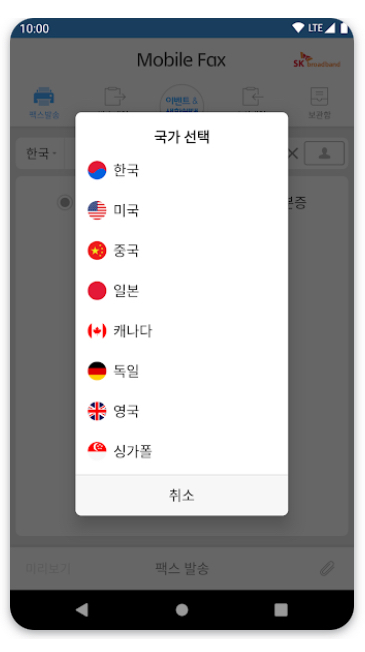 • 국제팩스 발송 시 지원 국가를 선택하고 발송 절차를 따릅니다