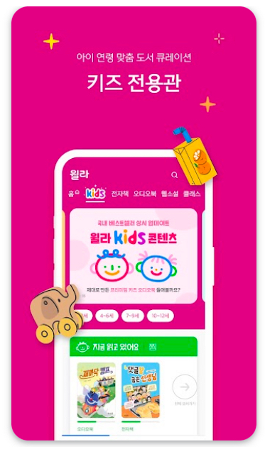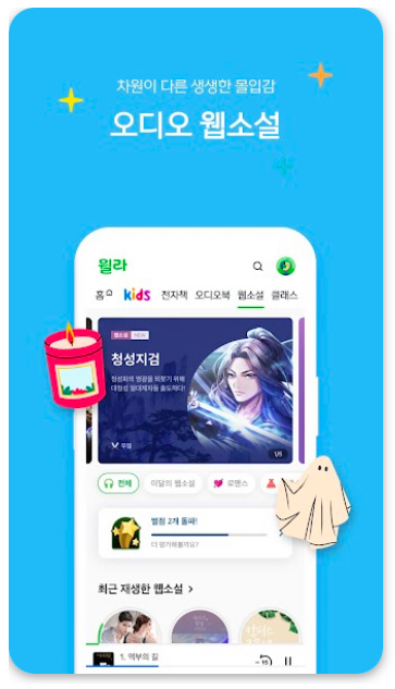 또한 전자책 뷰어를 통해 원하는 글꼴, 배경, 글자 크기 등을 설정할 수 있어 사용자가 편안하게 독서를 이어갈 수 있습니다. 더불어 키즈 콘텐츠, 웹소설 오디오, 자기계발 강연까지 폭넓은 콘텐츠를 제공하기 때문에 다양한 연령대가 활용할 수 있는 앱입니다.