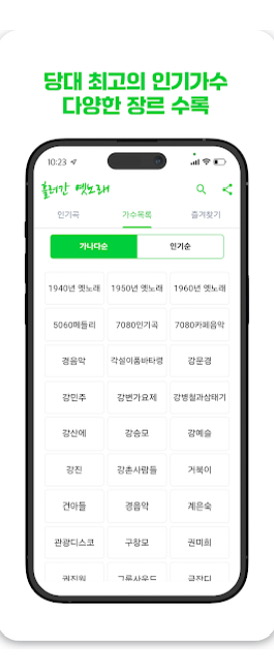 1. 앱 실행 후 화면에서 연대별 또는 장르별 노래 목록을 확인합니다.